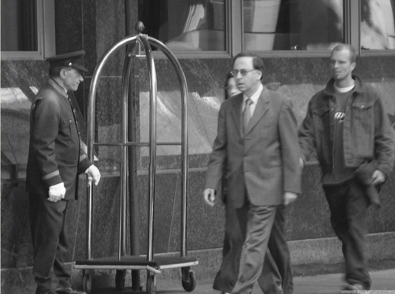 Since there are not many things to remember about this image, we should pay special attention to small details which we might usually ignore. For example, notice the direction each person is facing. We see each person's left side, other than the doorman whose right side is towards the camera. We may also notice the wheels on the luggage cart and that the man on the far right has something in his left hand.
