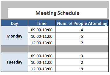 The maximum number of people who attended a meeting, according to the table, is: 9 . The CEO and his secretary equal 2 extra people attending each meeting. Therefore, 9+2=11 people.