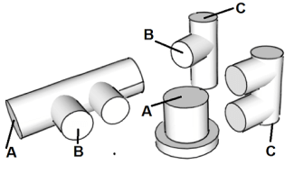 Look at the ends marked B. If the ends marked B were put together, how would they look? Of the five pictures, only pictures 2 and 4 have the ends marked B put together. Now, look at the ends marked C. Which of pictures 2 and 4 show that the two places marked C are put together? Of the two, only picture 4 has the places marked C put together.
