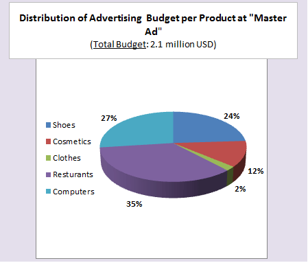 Cosmetic products amount to 12% of the advertising budget while Shoe products amount to 24% of the budget. Adding both categories together, we arrive at a total of 36%.