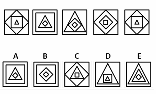 Thus, the outer shape in the missing frame should be a square (just like the middle shape in the 5th frame), the middle shape should be a triangle (like the inner shape in the 5th frame), and the inner shape should be a diamond (like the outer shape in the 4th frame).